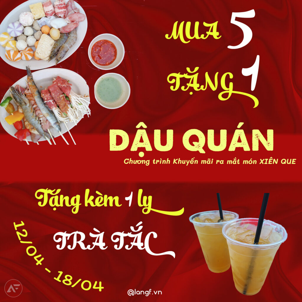 Từ ngày 12/04 – 18/04, lẩu thả viên Dậu quán ra mắt món Xiên que đồng thời mang tới khuyến mãi cực khủng dành cho con dân Làng đại học.