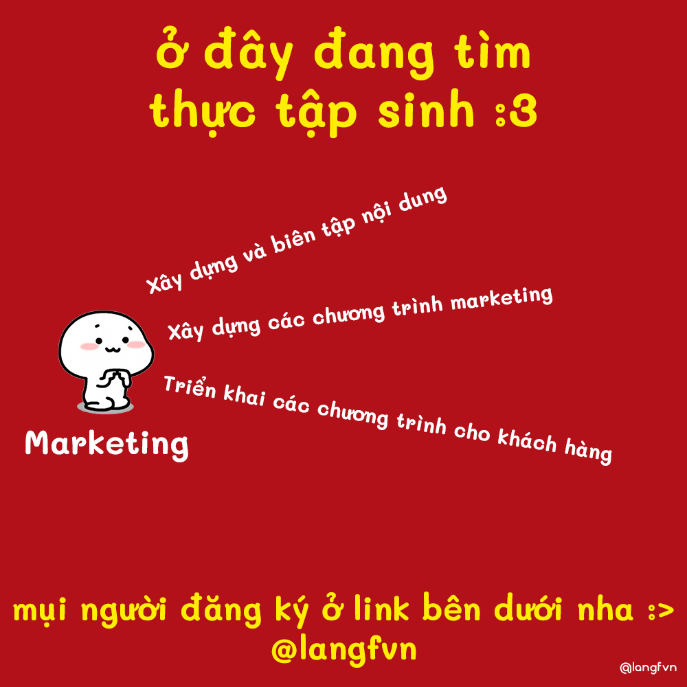 Nhằm tạo điều kiện cho các bạn sinh viên được tiếp xúc nhiều hơn với công việc liên quan đến Marketing trên thực tế, cũng như bổ sung thêm nguồn lực cho quá trình phát triển của dự án Langf.vn nói riêng và Công ty nói chung, Langf.vn quyết định tổ chức tuyển thực tập sinh Marketing (fulltime) năm 2021.