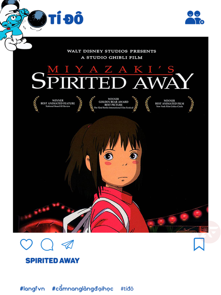 Mở đầu là 1 bộ phim anime xuất sắc nhất của Ghibli – Vùng đất linh hồn. Có thể nói rằng mỗi lần xem lại Spirited Away, Tí Đô sẽ ngộ ra 1 điều gì đó mới mẻ đến từ bộ phim mà có thể xem qua 1 lần bạn sẽ không thể nào hiểu hết ý tưởng mà tác giả muốn truyền tải.