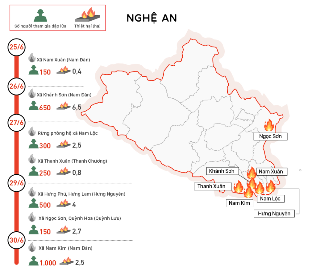 Từ 25/6 đến 1/7, hàng loạt vụ cháy rừng đã xảy ra ở 4 tỉnh miền Trung khiến các địa phương phải huy động hàng nghìn người dập lửa.